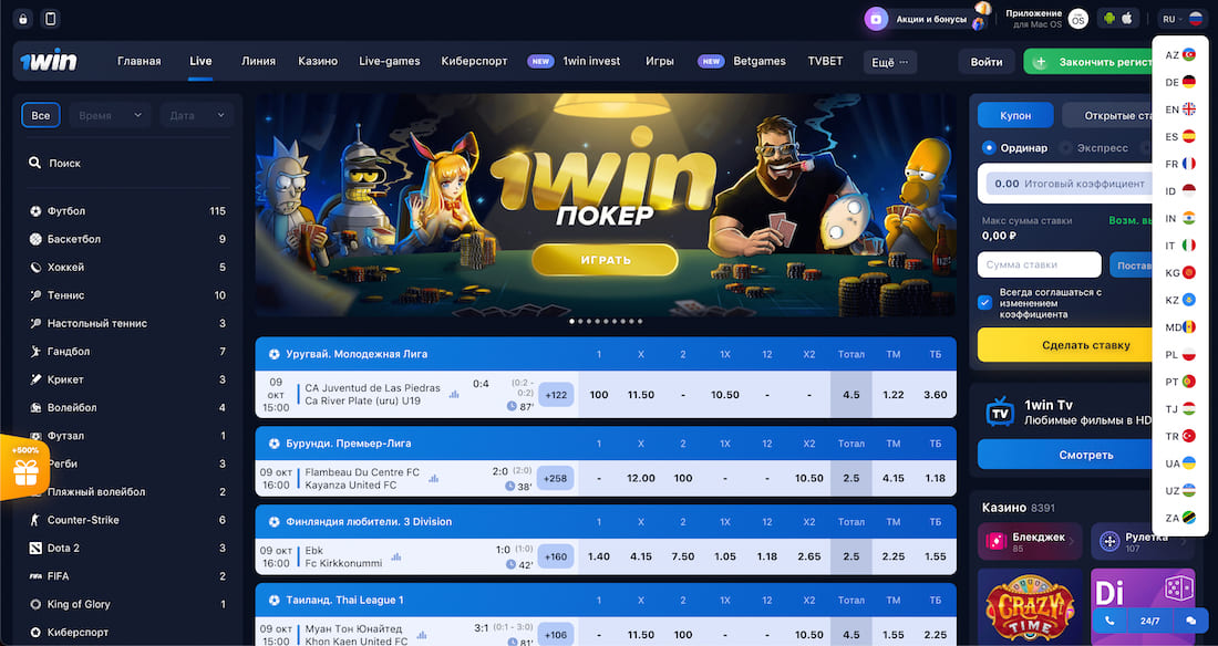 Букмекерская контора 1 вин предлагает своим клиентам широкий выбор прогнозов на различные виды спорта. Пользователи могут делать ставки не только на такие популярные дисциплины, как футбол, хоккей, баскетбол, теннис, но и более экзотические виды спорта – дартс, снукер, керлинг, флорбол. Кроме этого, компания предлагает ставки на киберспорт, который во многих странах является полноценным видом спорта и его популярность растет с каждым годом.